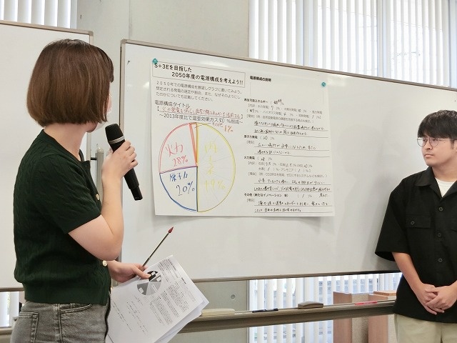 最後に行われたグループワークでは、「S+3Eを目指した2050年度の電源構成を考えよう!!」をテーマに討議を実施しました。再生可能エネルギーの拡大や原子力の位置づけ、火力発電の縮小などについて意見を交わし、コスト・安全性・環境負荷といった観点を踏まえながら、現実的で持続可能なエネルギーミックスを考える貴重な機会となりました。