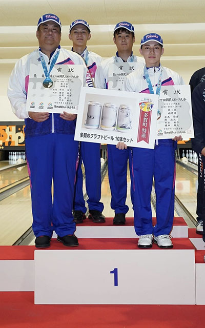 しかしながら、4人チーム戦ではこれまでの反省を活かし、チーム全体で冷静に試合へ臨むことができました。その結果、予選を1位で通過し、決勝では滋賀県チームとの接戦を制することができました。予選・決勝を通じた計6ゲームで1277点を記録し、優勝に大きく貢献することができました。
