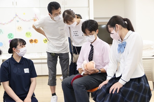 これまで合計で高校3年生3名、2年生1名と付き添いの方5名に参加していただき、本学科の3年次生および4年次生が行っている学内実習(母性看護学実習)を見学していただきました。母性看護学実習では実際の妊婦さんご夫婦に来校していただき育児体験教室を開催しています。参加された方には、学生の奮闘ぶりを見学してもらい、妊婦さんご夫婦と一緒に妊婦体験や赤ちゃん抱っこなどを体験していただいています。少人数で行っていますので、和気あいあいとした雰囲気のなかゆっくりとお話ができています。