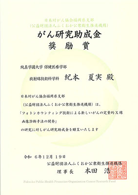 2024年12月19日に公益財団法人ふくおか公衆衛生推進機構の「第59回がん研究助成金」の贈呈式が行われ、放射線技術科学科の紀本夏実講師が奨励賞を受賞しました。