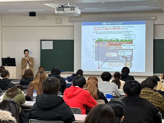 2025年12月11日(木)5限、純真学園大学2号館講義室3にて、原子力発電環境整備機構(NUMO)広報部地域コミュニケーショングループの江崎久美子先生をお招きし、「高レベル放射性廃棄物の地層処分について」をテーマとした勉強会を開催しました。参加者は放射線技術科学科2年生、計82名でした。
