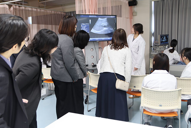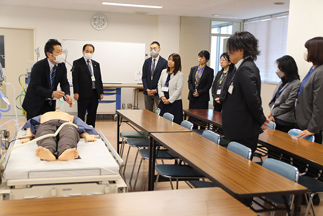 会議に先駆け、参加者の皆様に本学の施設を見学していただきました。看護学科の高機能シミュレーター人形をはじめ、放射線技術科学科のCT装置、医療工学科の生命維持管理装置、検査科学科では、学生が生理機能実習を行っている様子を見学しました。