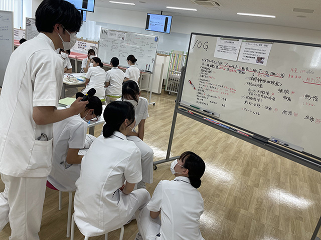 初日の「術後観察」では、全身麻酔や手術が身体に及ぼす影響を踏まえながら、患者の全身状態の観察を行いました。心電図モニターやドレーンなど、多くの医療機器を装着した患者を前に戸惑いながらも、グループワークを通して観察項目や観察方法について検討しました。演習を重ねる中で、次第に詳細かつ丁寧な術後観察が行えるようになりました。