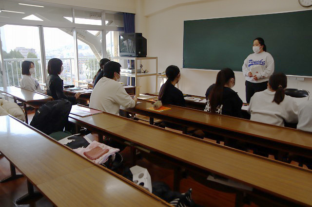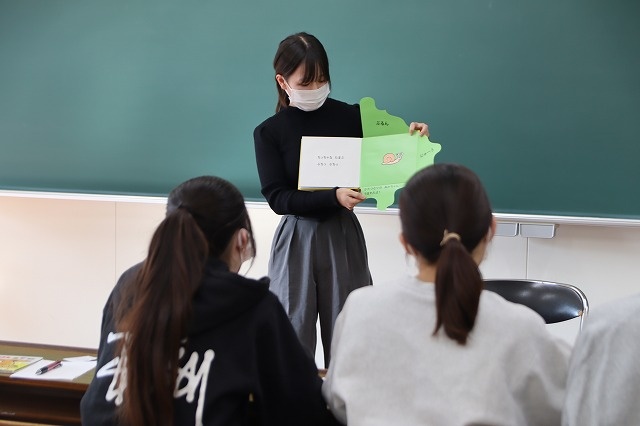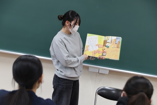 「絵本の読み聞かせ演習」は、子どもにとって語彙力の発達を助けるだけでなく、知的好奇心を育む情操教育にもなります。学生は、読み聞かせを行う子どもの認知の発達段階や集中できる環境を考えてアセスメントを行い実施します。学生間で、読み手役と聞き手役を行うことで、子どもの成長段階や子どもの気持ちを理解する一助となっています。