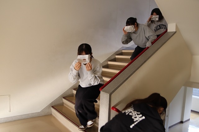 学生からは「子どもの視野ってこんなに狭いことに気づいた」「階段は危ない、危険」「エレベーターは怖い」といった声が聞かれ、安全を守る支援方法について学びを深めていました。