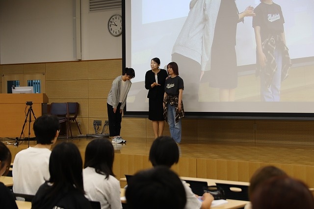 2回目は「自分の姿を知る」として、小笠原流礼法総師範の岩見菱礼先生にご登壇いただきました。「こころ」と「かたち」の大切さや「察する」「慎む」という日本人として大切にしたいこころについて、具体例を交えて講演いただきました。実際にお辞儀の仕方や物の受け渡しの仕方などもご指導いただきました。普段の生活で自分の姿を見直すことはなかなかありませんが、ペアを組んでお互いの所作を確認することで、他者からの視点を意識する貴重な経験となりました。