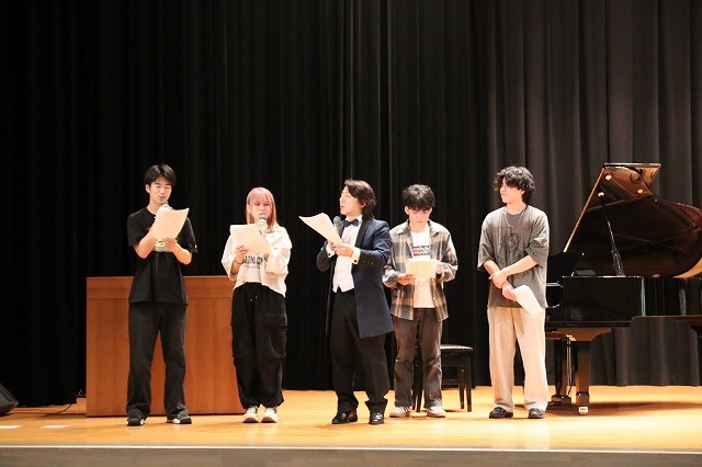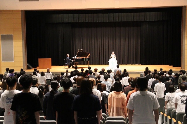 当日は、ソプラノ歌手の小林瑞花先生、ピアニストの津島圭佑先生も加わり、日本の名曲やオペラの楽曲をご披露いただきました。初めて聴くオペラ歌手の圧倒的な声量に、学生たちは魅了されていました。