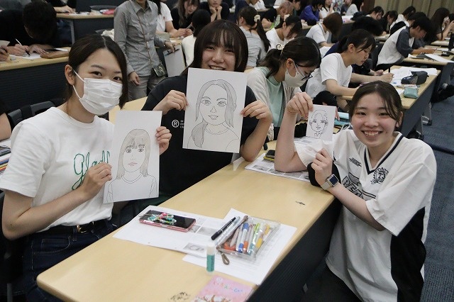 その後、学生同士で似顔絵を描くワークショップを行い、宮本先生をはじめ、嶋田ヤスヒコ先生、しろこ先生、安永たけし先生、よっしー先生の計5名の先生方から、一人一人に丁寧なアドバイスをいただきました。絵が「共通言語」であることを再認識するとともに、他者に描いてもらうことで、自分では気づきにくい自らの特徴を知る機会となりました。
