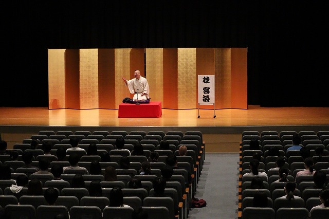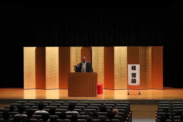 本学では落語鑑賞の際に、人気番組「笑点」の大喜利メンバーである桂宮治師匠をお招きしました。師匠のご経歴と、人間関係の構築において大切にされてきたことについて熱く語っていただき、最後に落語をご披露いただきました。