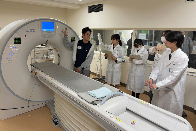 放射線技術科学科のプログラムでは、本学に設置されている一般撮影装置、CT装置、MRI装置などの医療用画像機器について、見学および操作体験を通して学びました。各装置の特徴や役割を理解するとともに、それらの医療現場での活用について、参加者全員で考える機会となりました。